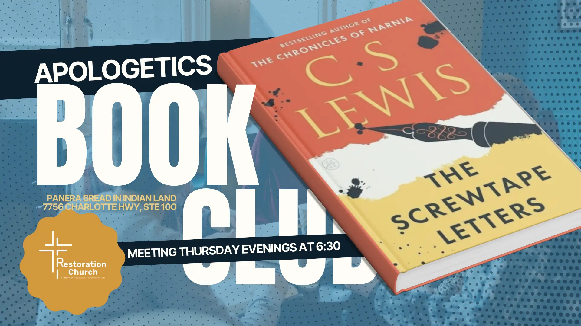 The Monday night book club meets at 6:30 each week at Panera Bread Indian Land, SC. |